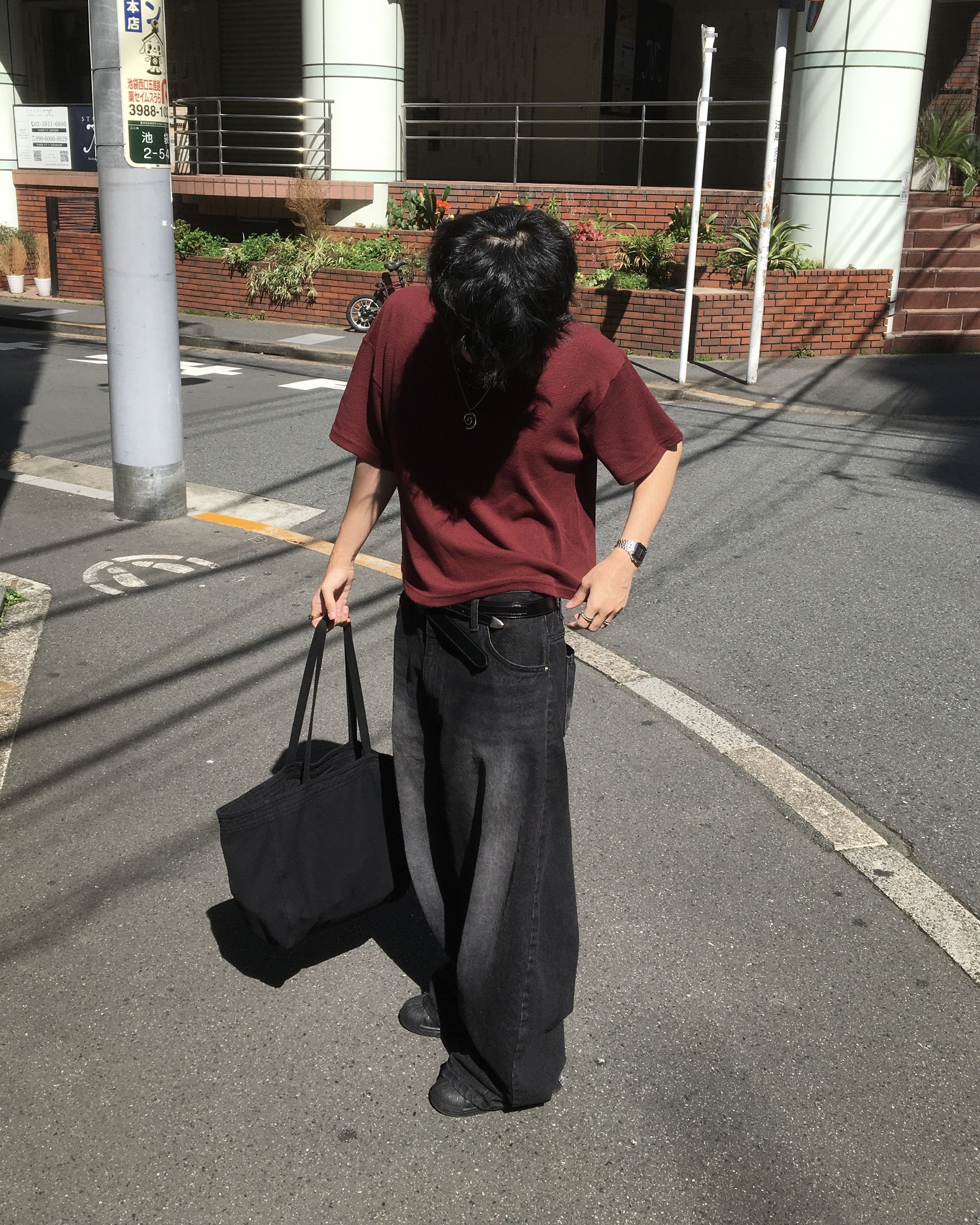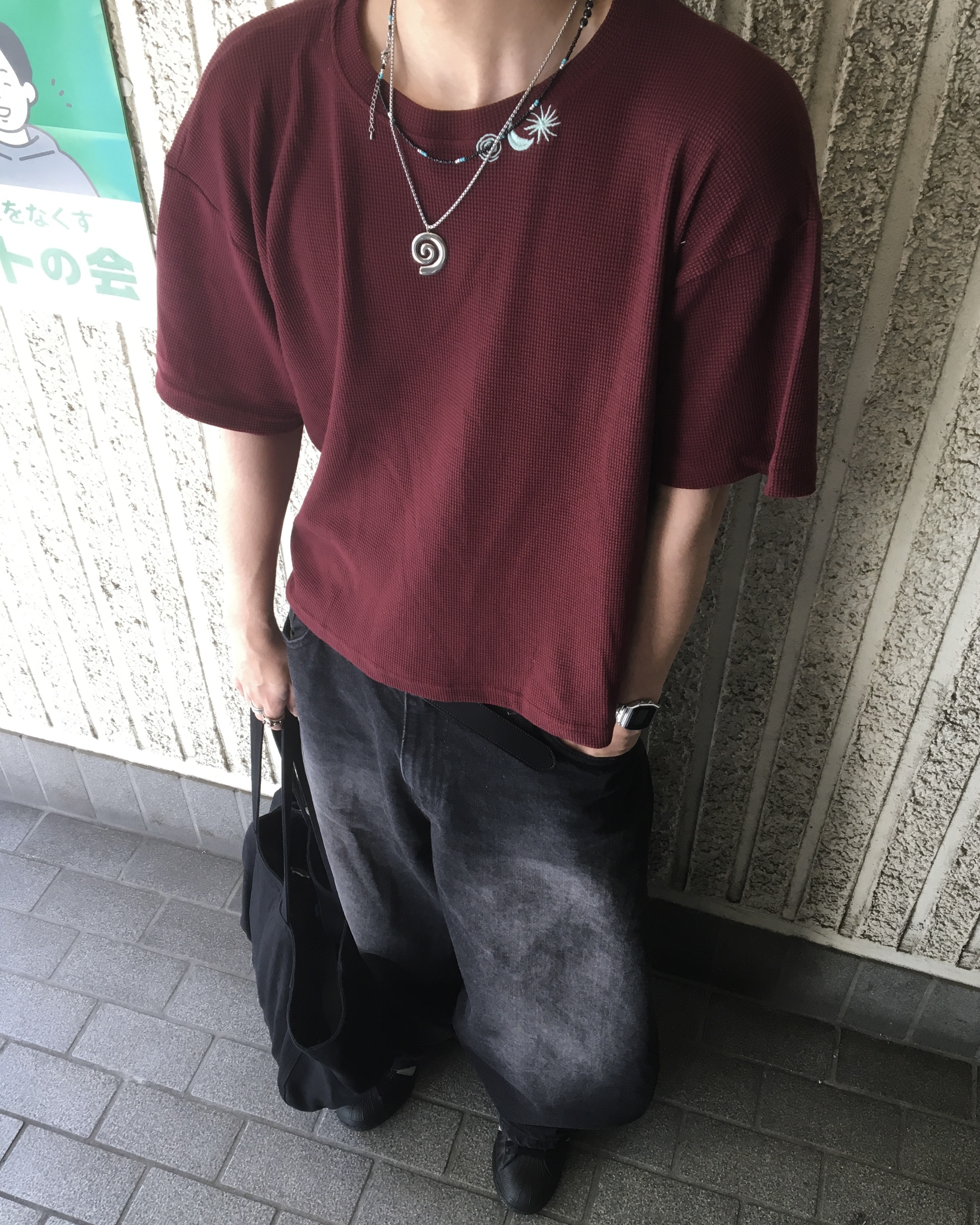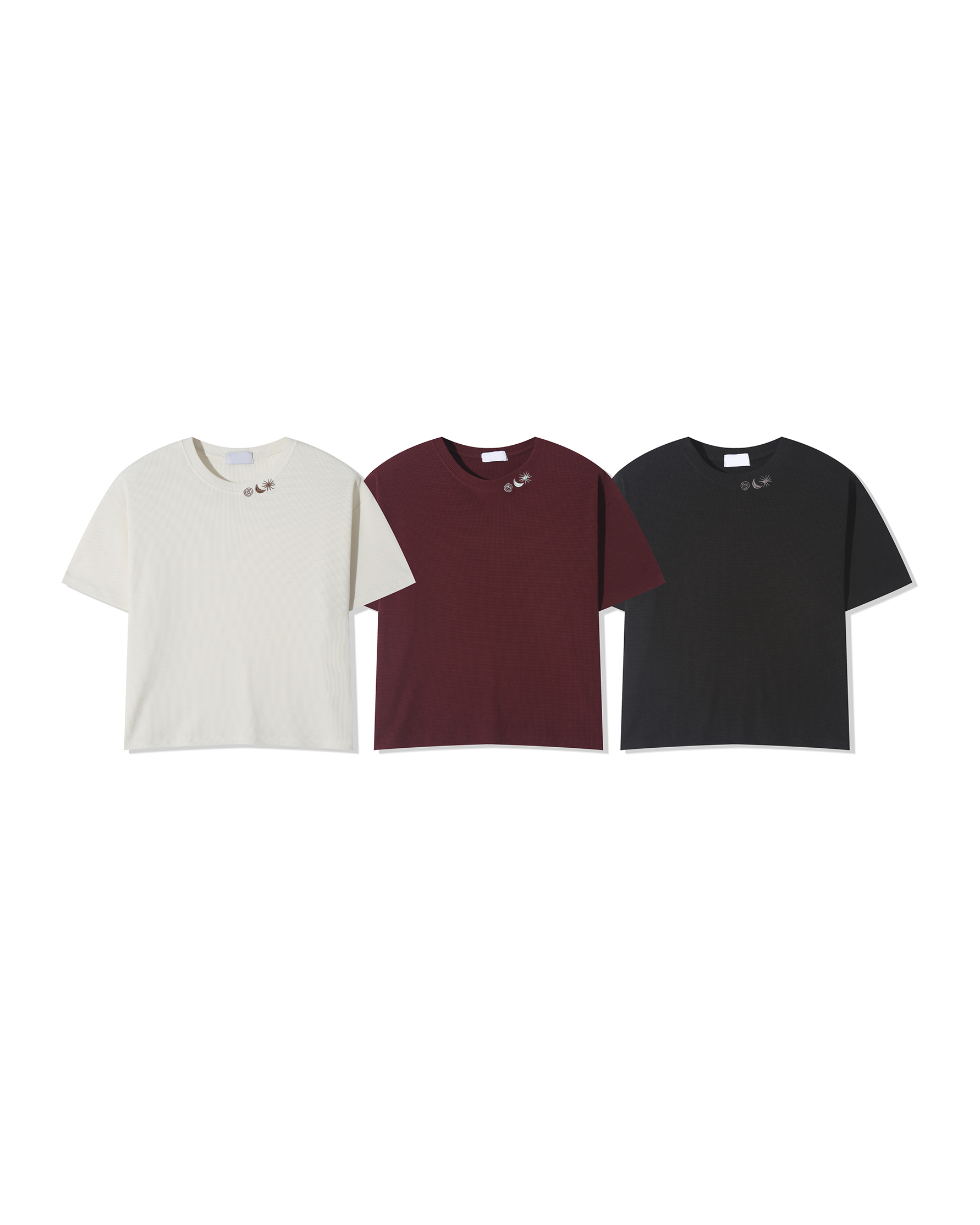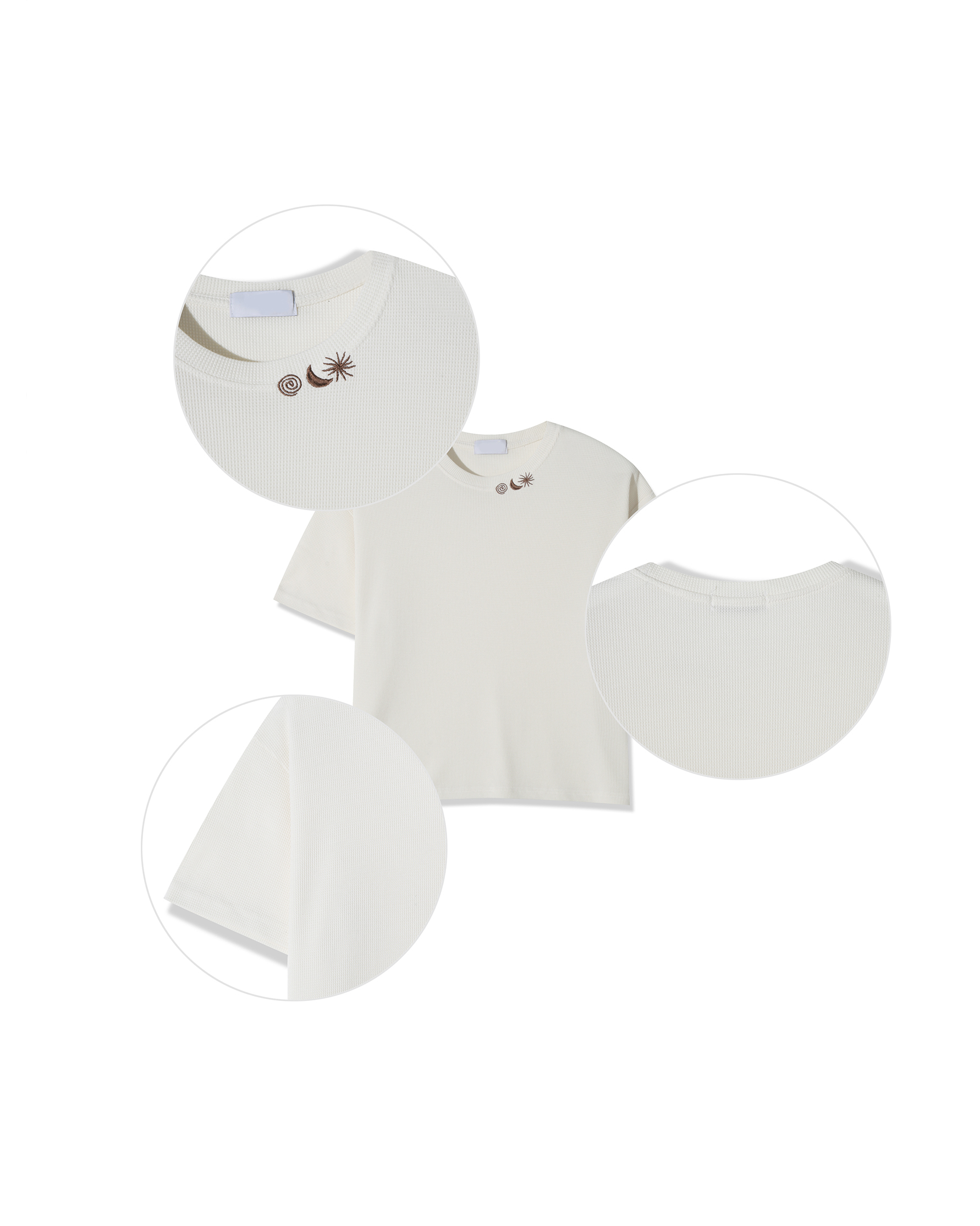 (男生示範:L size|①刺繡領口設計|②華夫格材質|➂短版版型 )